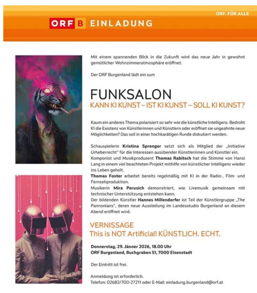 ORF Burgenland is kicking off the new year with an exciting look into the future—warm, relaxed, and full of conversation. We’re thrilled to be part of this evening: the Funksalon brings together different voices to discuss a question that’s on everyone’s mind:“Can AI create art – is AI art – should AI be art?” A […]